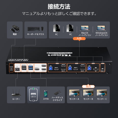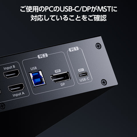 HDC403-P23 は、USB-C ノートパソコン1台とデスクトップ3台に最適な、MST 技術を用いたアップグレードされた三重ディスプレイ設計を採用しており、入力1と入力2を強化してシームレスな三重ディスプレイ出力を実現します。内蔵電源モジュールにより、ノートパソコンの電源問題を解決し、4台のPC(3台のデスクトップ + 1台のノートパソコン)をサポートする11in1ドッキングステーションを提供します。周辺機器用の多彩なポート、USB 3.0、USB 2.0、LAN、ヘッドフォンジャック、HDMI出力を備えています。このデバイスはHDMI 2.0互換で、最大4K@60Hzの解像度および1080Pと2560x1440の高リフレッシュレートをサポートし、高解像度と高リフレッシュレートが求められるアプリケーションに最適です。HDC403-P23 には KVM-to-PC ケーブルが含まれ、EDID エミュレーション、K&M パススルー、一鍵で KVM をロックする機能など、多くの高度な機能を備えており、簡単に設定および使用することができます。