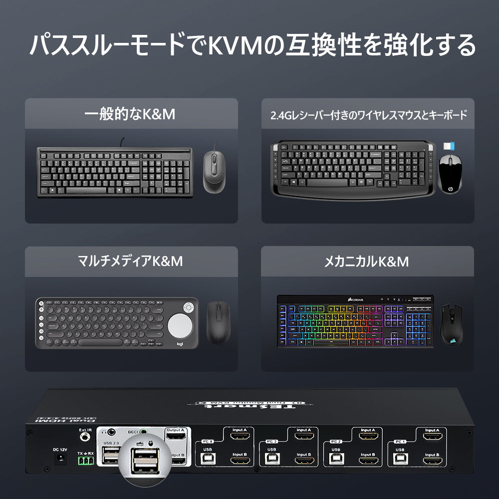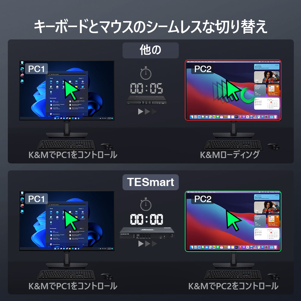 - 1つのキーボードとマウスを使用して4台のコンピューターを2つのモニターに切り替えて制御します。キーボードとマウスのシームレスな切り替え可能です。