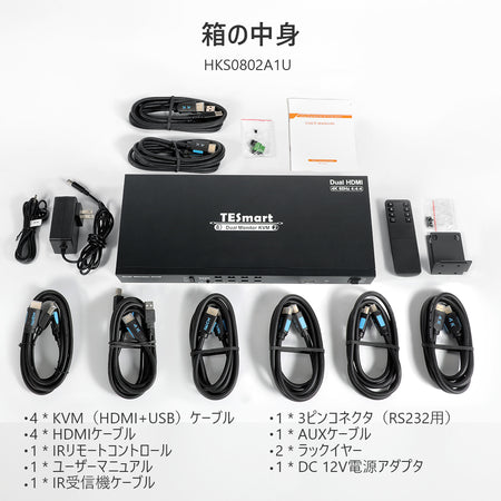 - KVMスイッチには、PCとKVMスイッチを接続するための4本のHDMI/USBと、4本のHDMIケーブル(2番目のモニター用)が付属されました。