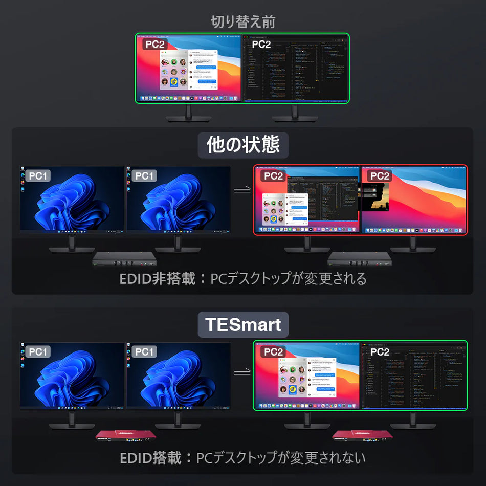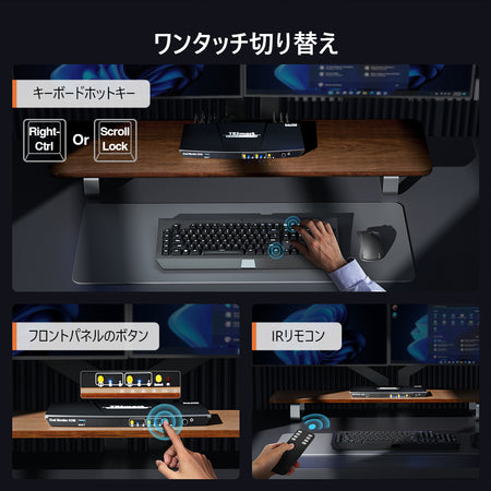 - 切替方法は3つあります:ホットキー、フロントボタン、またはリモートコントロールによる切り替えが可能で、切り替え後のキーボードとマウスの操作もシームレスです。