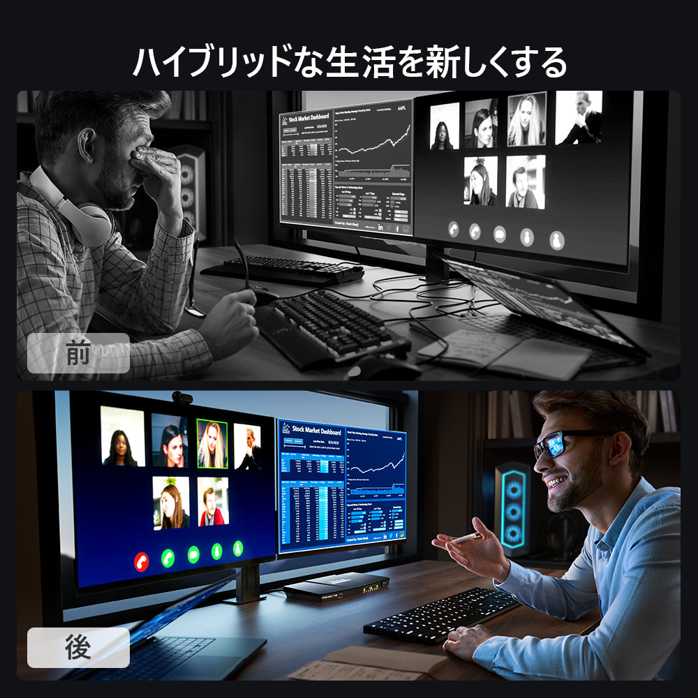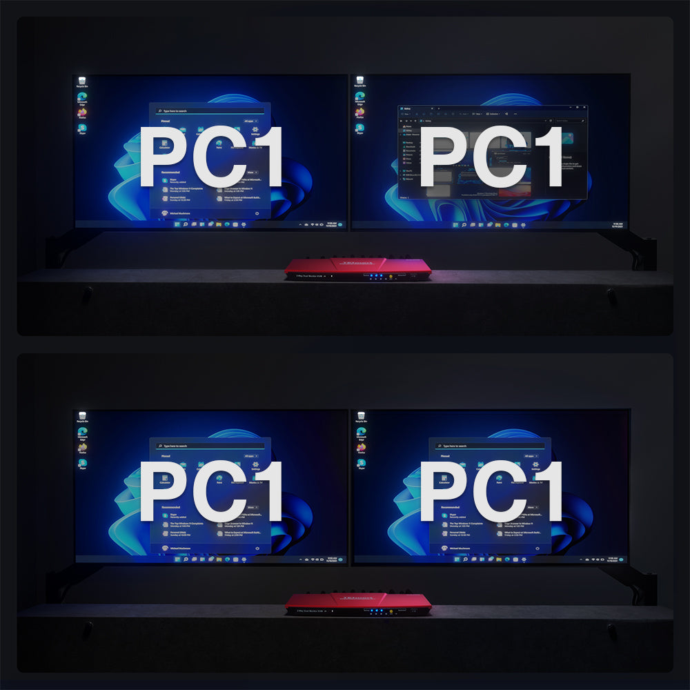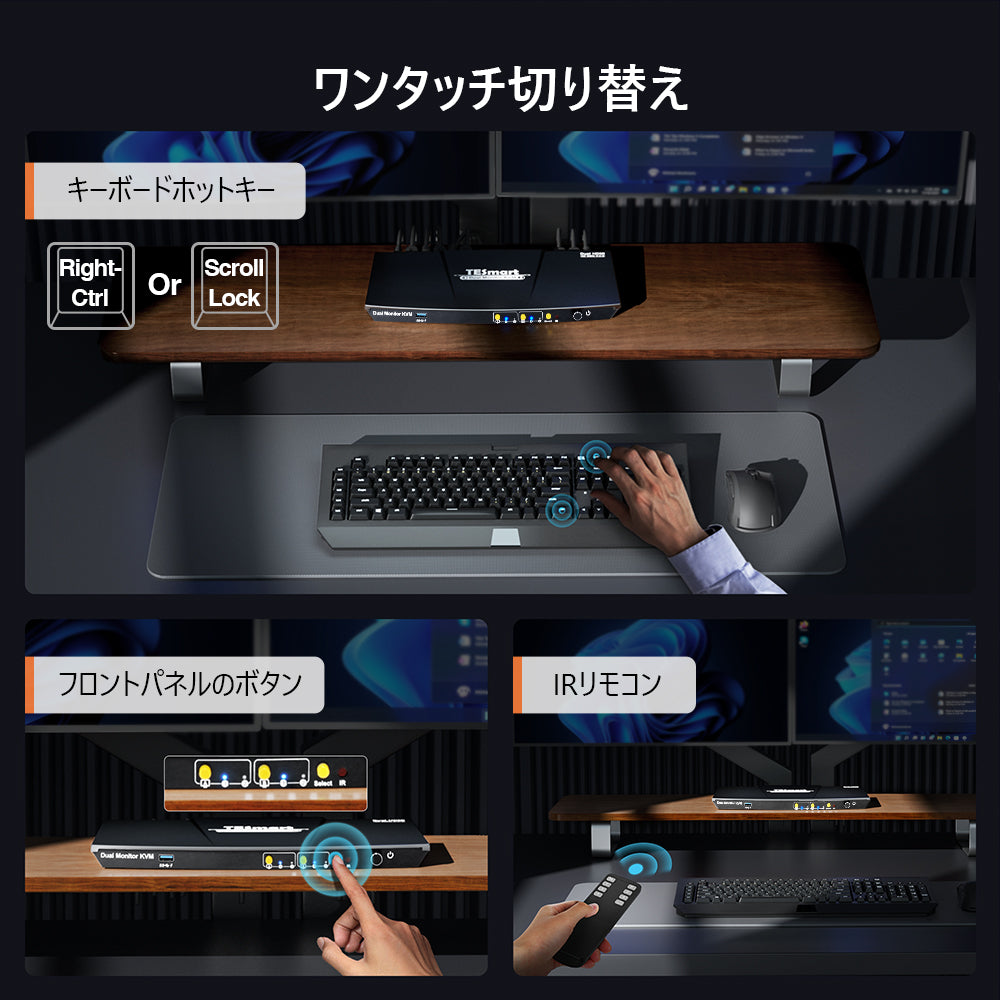 - 一組のキーボードとマウスで2つのPCを最大4K60Hzのデュアルディスプレイで効率的に管理できます。
