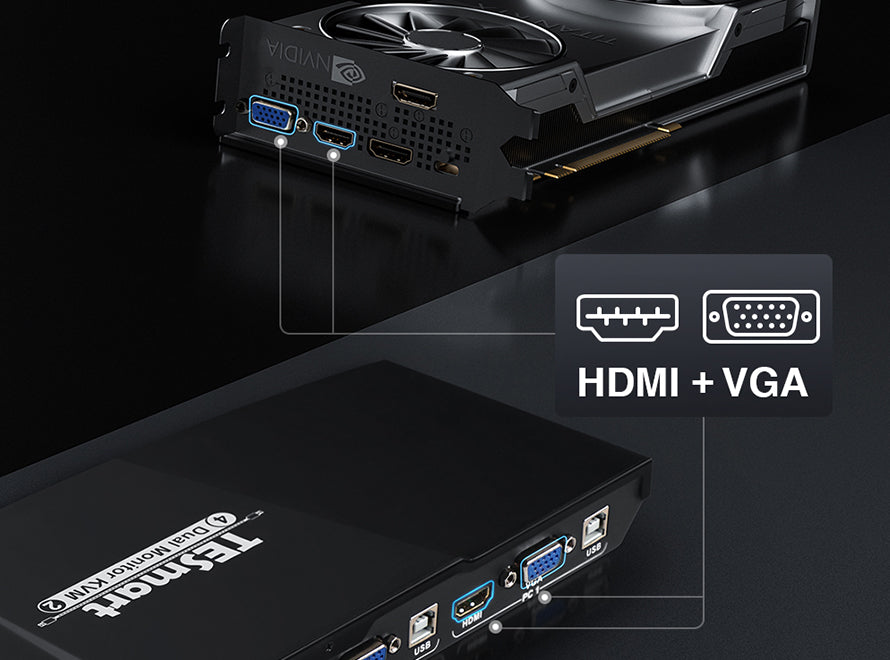 各PCは、デュアルモニターのためにKVMに対して2つのビデオ接続(HDMI + VGA)を行う必要があります。