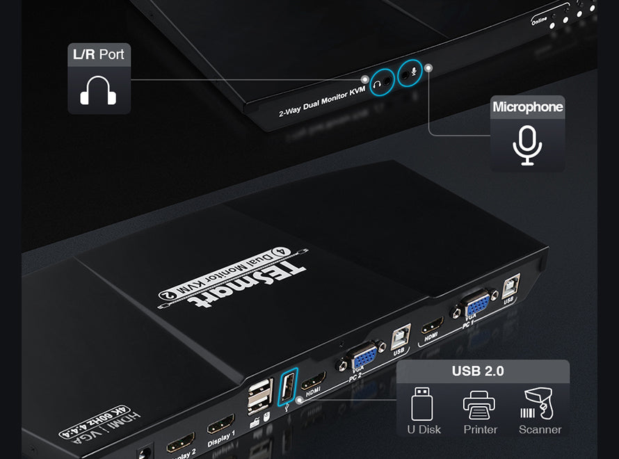 L/Rオーディオ出力ポートを介してヘッドフォンやスピーカーを簡単に接続し、シームレスなオーディオ出力をお楽しみください。USB 2.0デバイスを複数のデバイス間で共有し、セットアップを簡素化し生産性を向上させます。家庭、オフィス、または教育の環境に最適です。