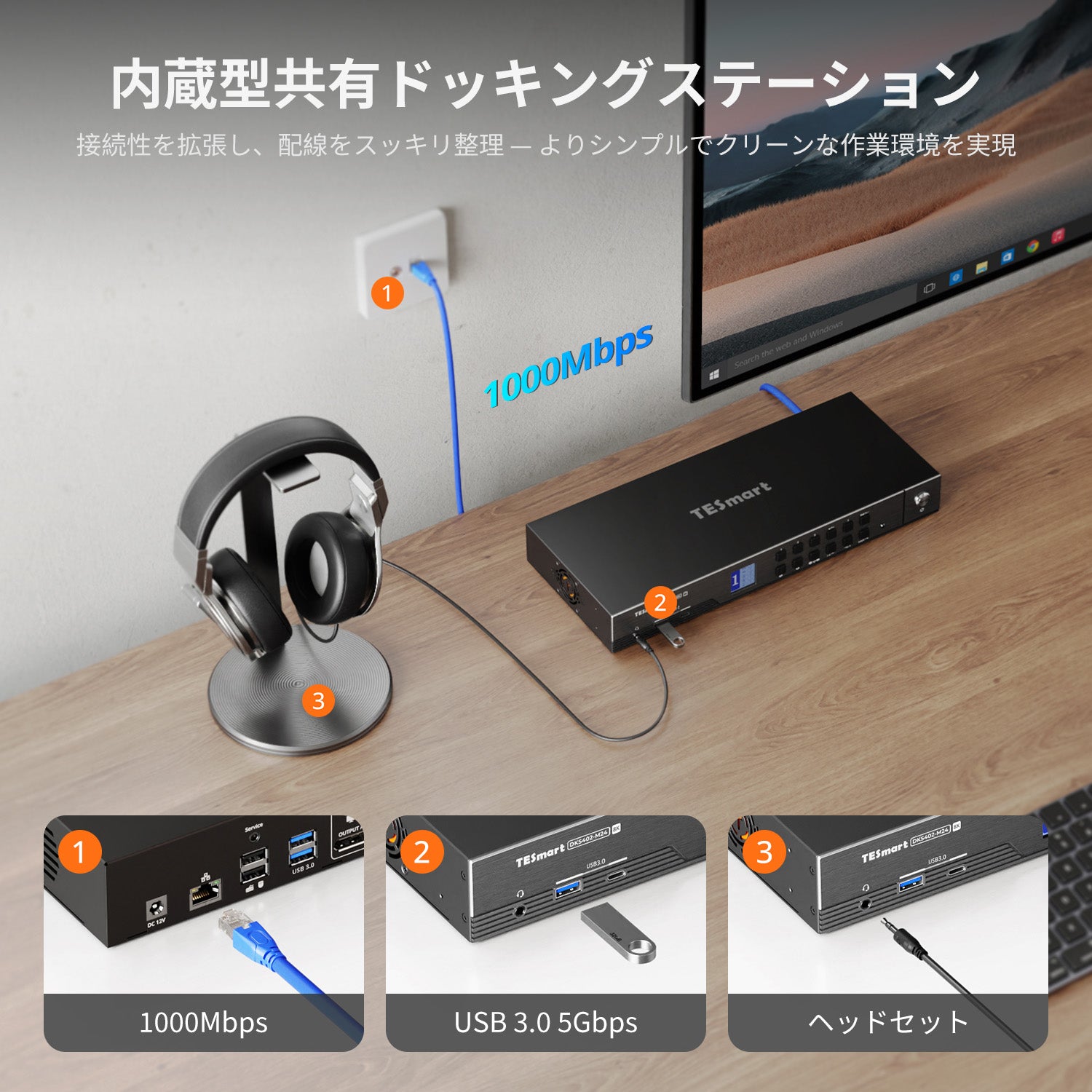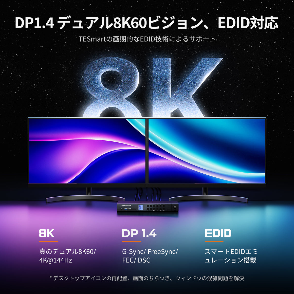 DP 1.4デュアル 8K@60Hz KVMスイッチ(ネットワークハブ & Smart EDID内蔵)– ITプロフェッショナル、クリエイター、マルチPC環境向け