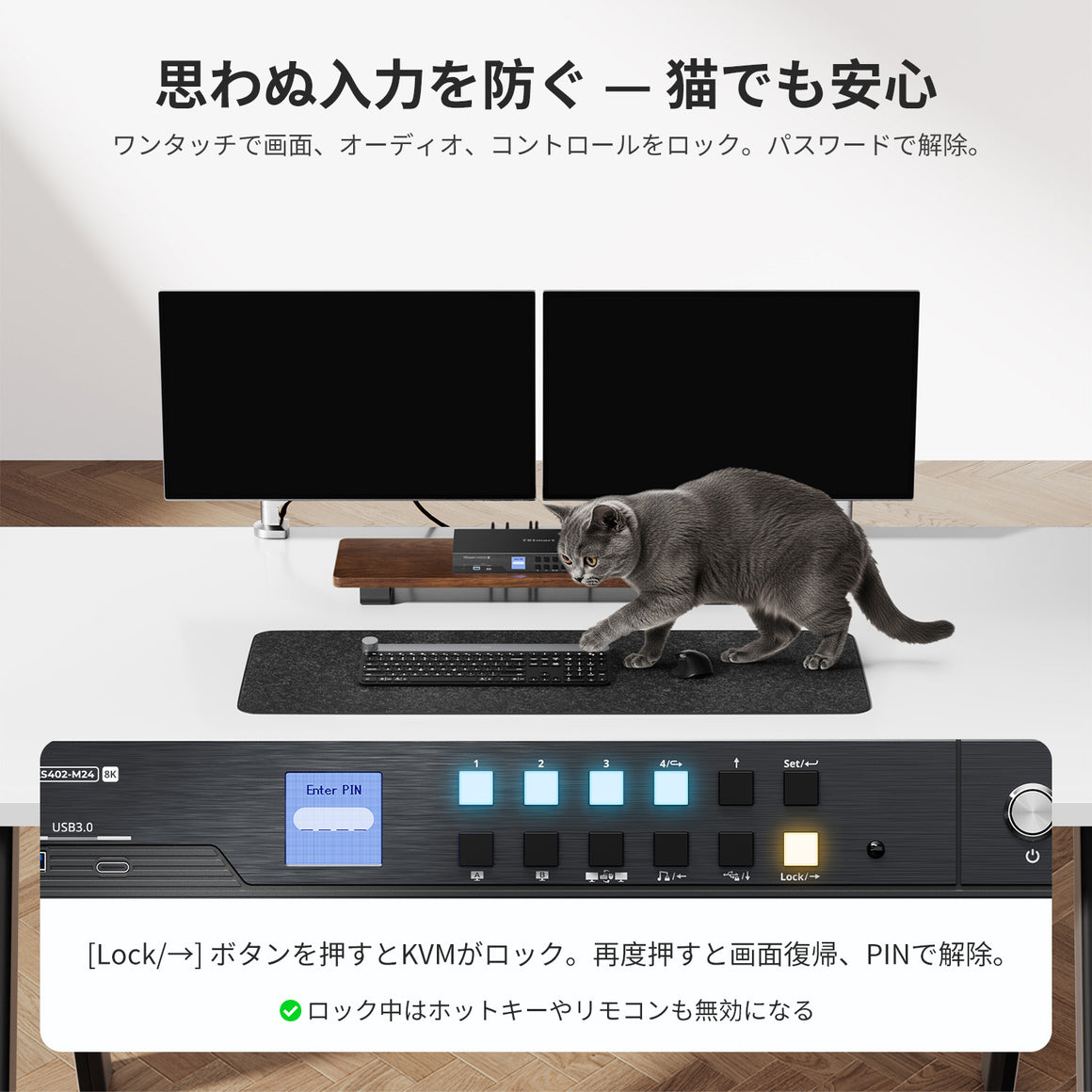 DKS402-M24 4x2 DisplayPort KVMスイッチは、わずか1台のキーボード、1台のマウス、2台のモニターを使って4台のコンピューターをシームレスに制御する必要があるプロフェッショナルやパワーユーザーのために設計されています。真実に迫る色と鮮明なディテールで、迫力の8K@60Hz解像度を実現。妥協のない視覚性能と合理化されたワークフロー管理を求める、動画編集者、デザイナー、開発者、マルチタスクをこなす方に最適です。