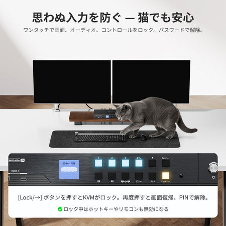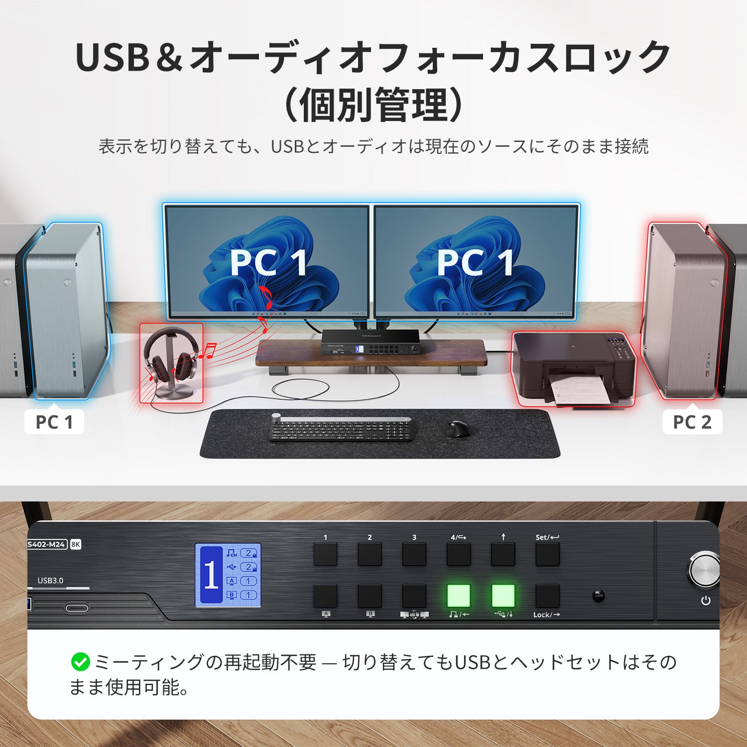 • EDIDエミュレーション & フォーカスロック: 切り替え時もディスプレイ設定を安定維持。オーディオやUSBのフォーカスを任意のPCに個別にロック可能で、マルチメディアワークフローに最適。