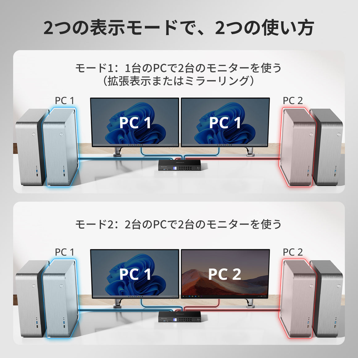 • デュアルモニターの柔軟性: 1台のPCから2台のディスプレイを拡張またはミラーリングモードで使用したり、各画面に異なるPCを表示したりできます。すべて簡単な切り替えで実現。