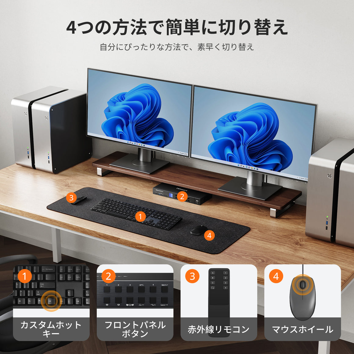 • 多彩な制御方法: フロントパネルのボタン、IRリモコン、キーボードホットキー、さらにはマウスホイールを使ってコンピューターを切り替え。