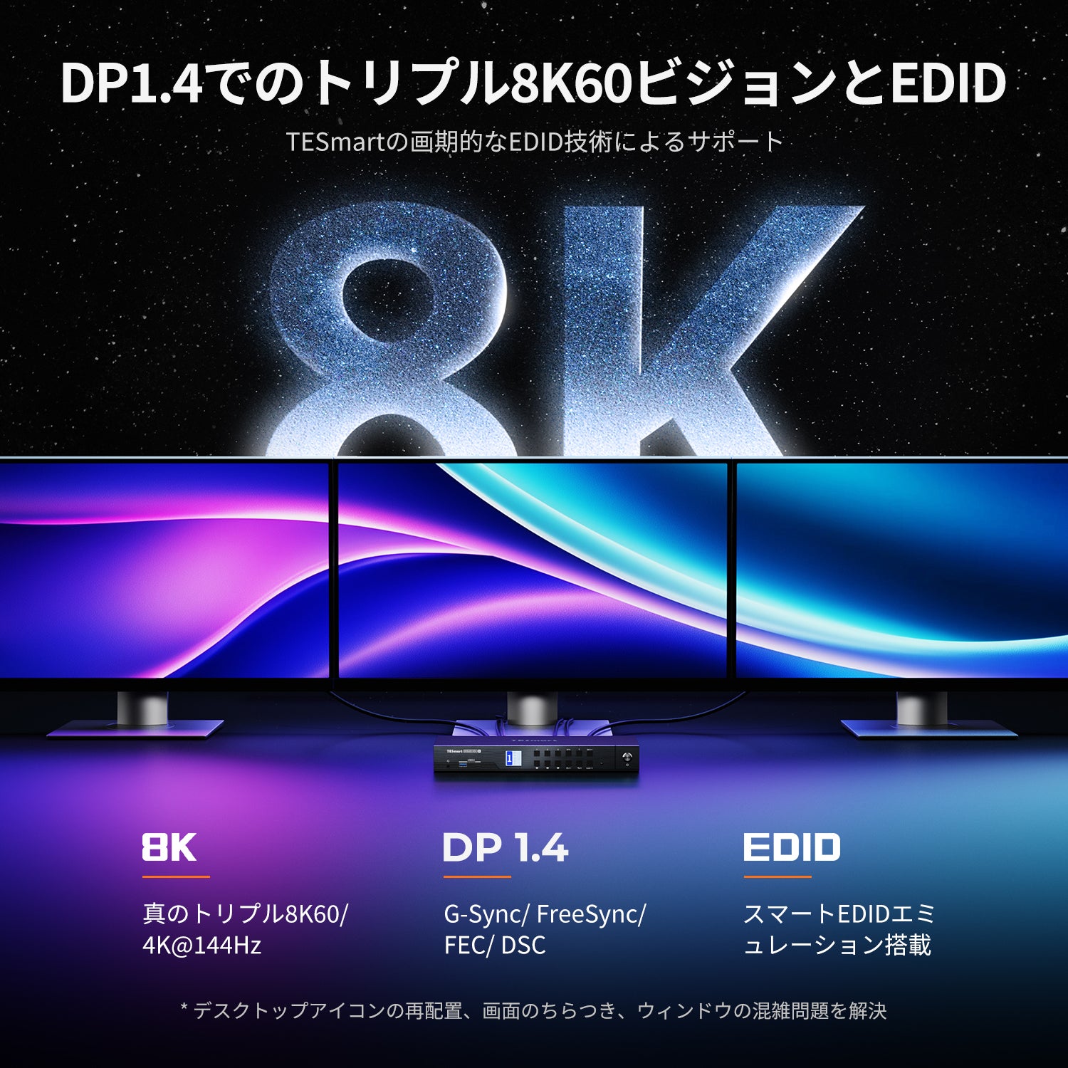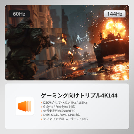 超高精細度サポート: 最大8K@60Hzを実現し、4K@120Hz/144Hzとも下位互換性があります。DisplayPort 1.4準拠で、鮮明で滑らかなビジュアルを提供。