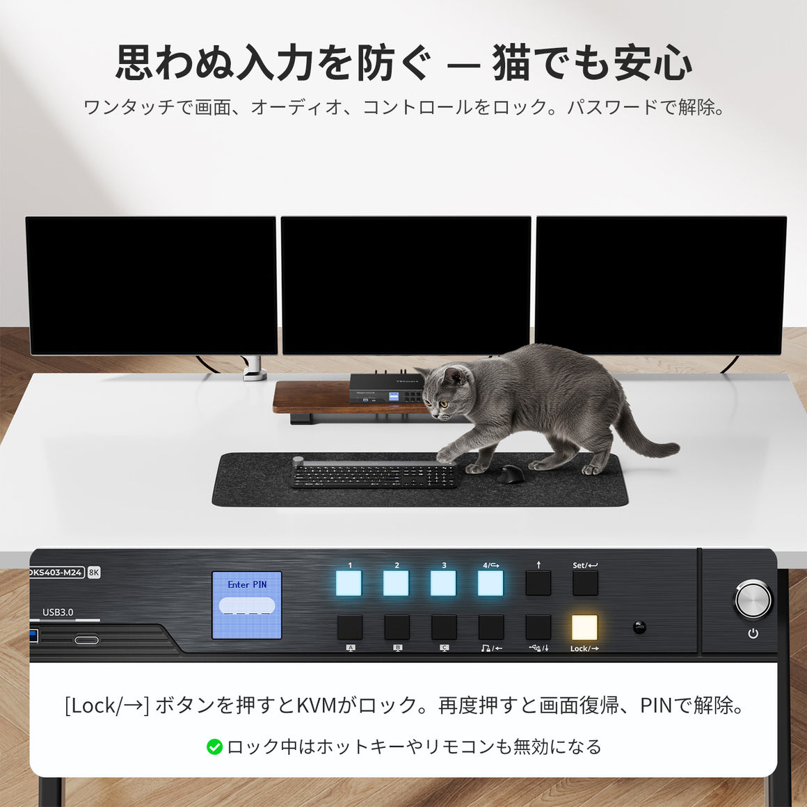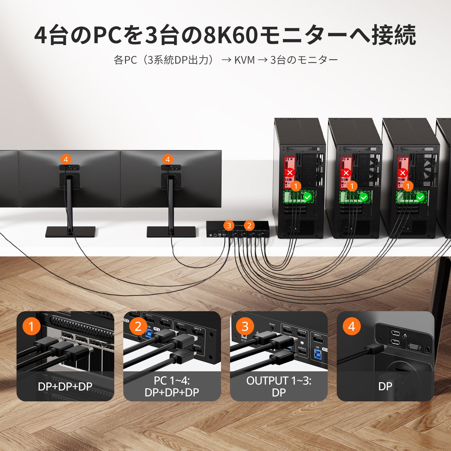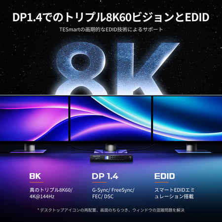 DP 1.4 トリプル 8K@60Hz KVM スイッチハブ (4台のPC、3台のモニター対応)、EDID、オーディオ/USB ロック & マルチスイッチング機能付き