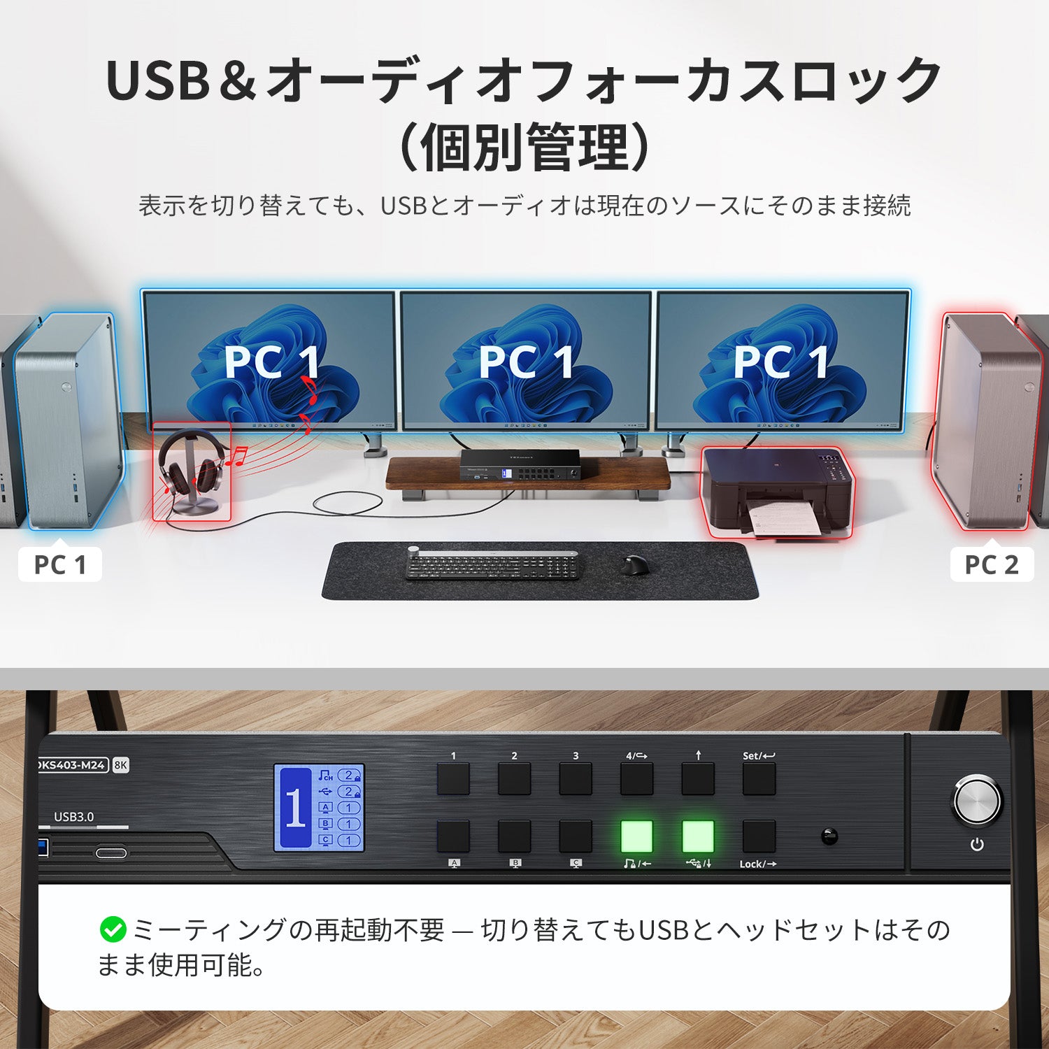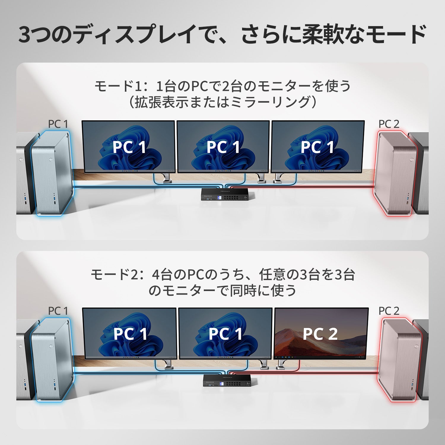トリプルモニターの柔軟性: 3台のディスプレイを使用して、1台のPCを拡張モードまたは複製モードで表示したり、各モニターに異なるPCを表示したりできます。全てはたった一組のキーボードとマウスで制御。