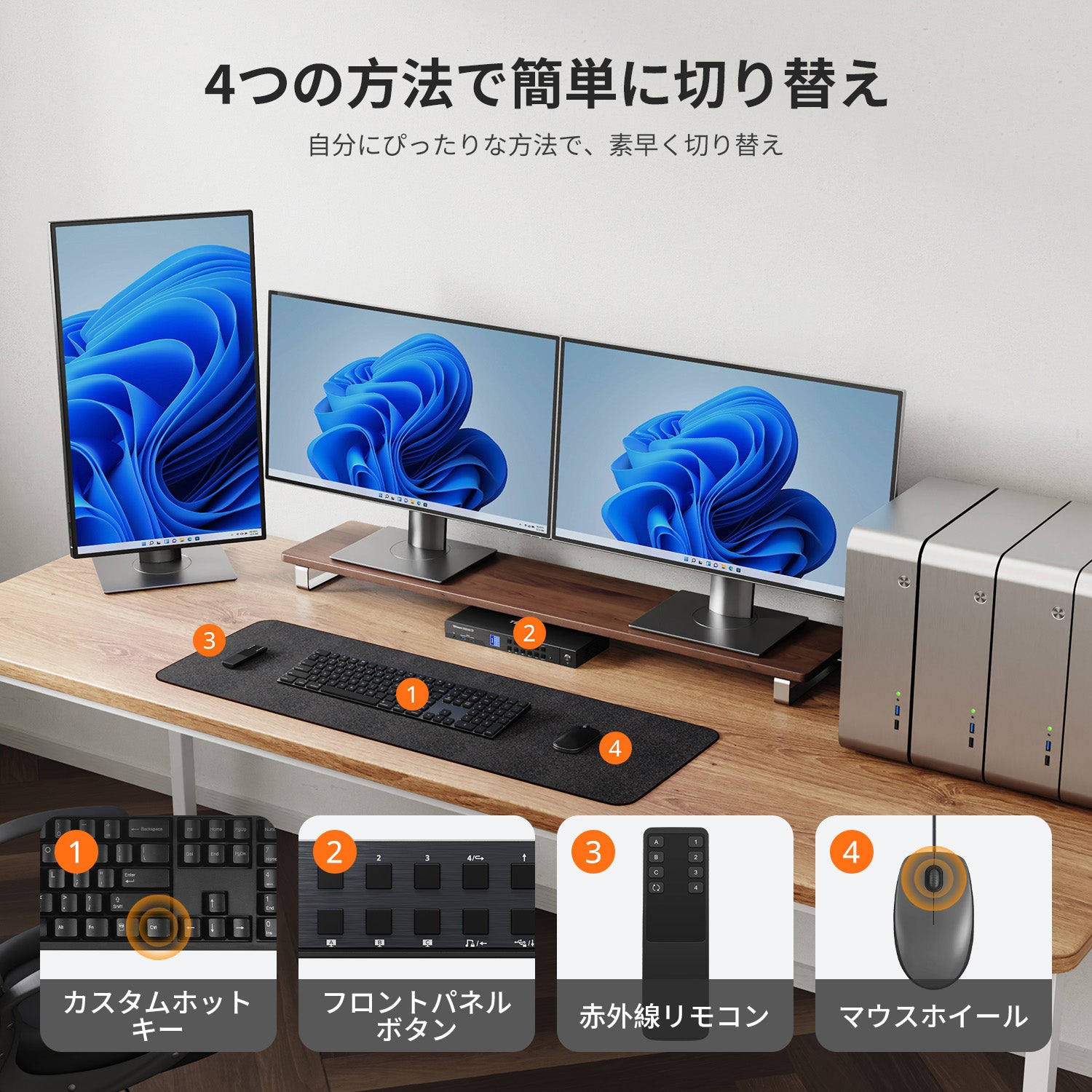 多彩な切り替え方法: フロントパネルのボタン、IRリモコン、キーボードホットキー、さらにはマウスホイールを使用してPCを切り替え。簡単な操作を実現。