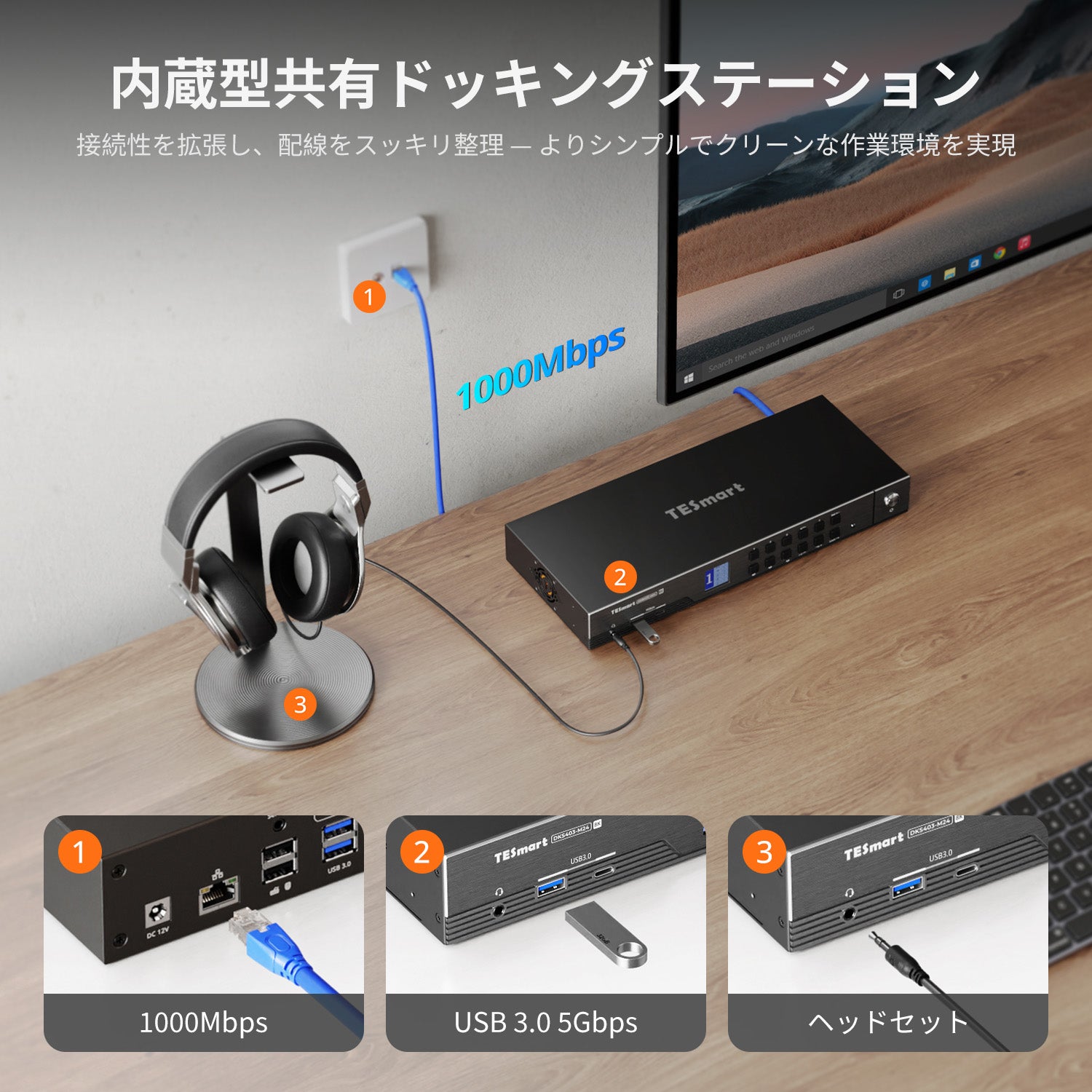 内蔵ネットワークスイッチ: 1つのギガビットイーサネット接続を接続された4台のPCすべてで共有。安定した高速有線ネットワークに追加のアダプターは不要です。