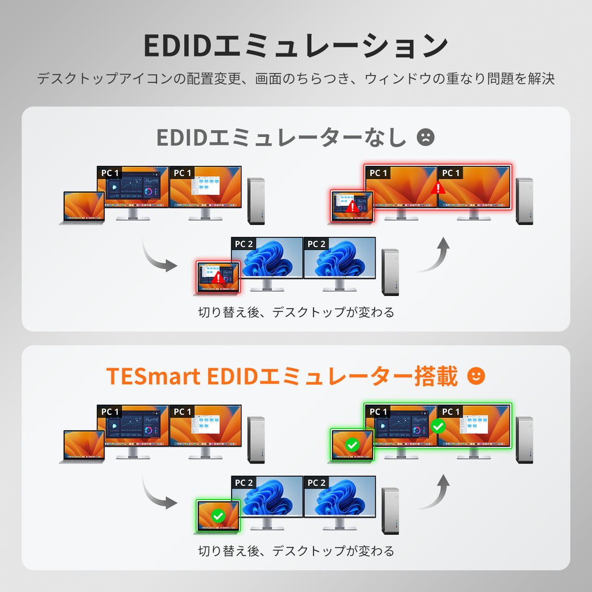 - KVMスイッチのEDIDエミュレータで、完璧なディスプレイ設定を維持します。