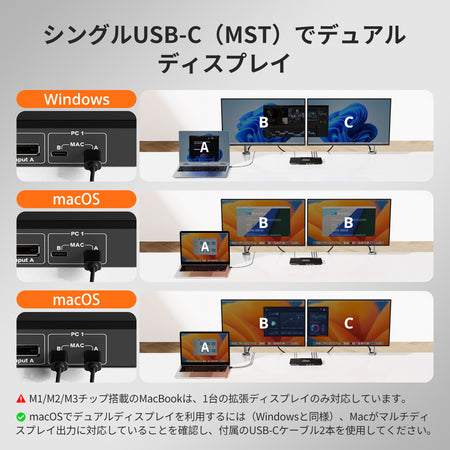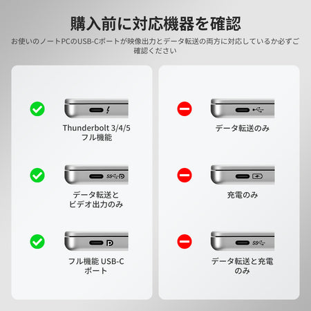 デュアルUSB-C入力は、Mac Mini/Studioでのデュアルディスプレイ拡張をサポートしません。20V DC充電に対応していないノートパソコンは7.5Wのみの供給となる場合があり、一部のThinkpadモデル(Yoga/Tシリーズ)は36Wをサポートしない可能性があります。ご注文の際はこれらの詳細にご注意ください。