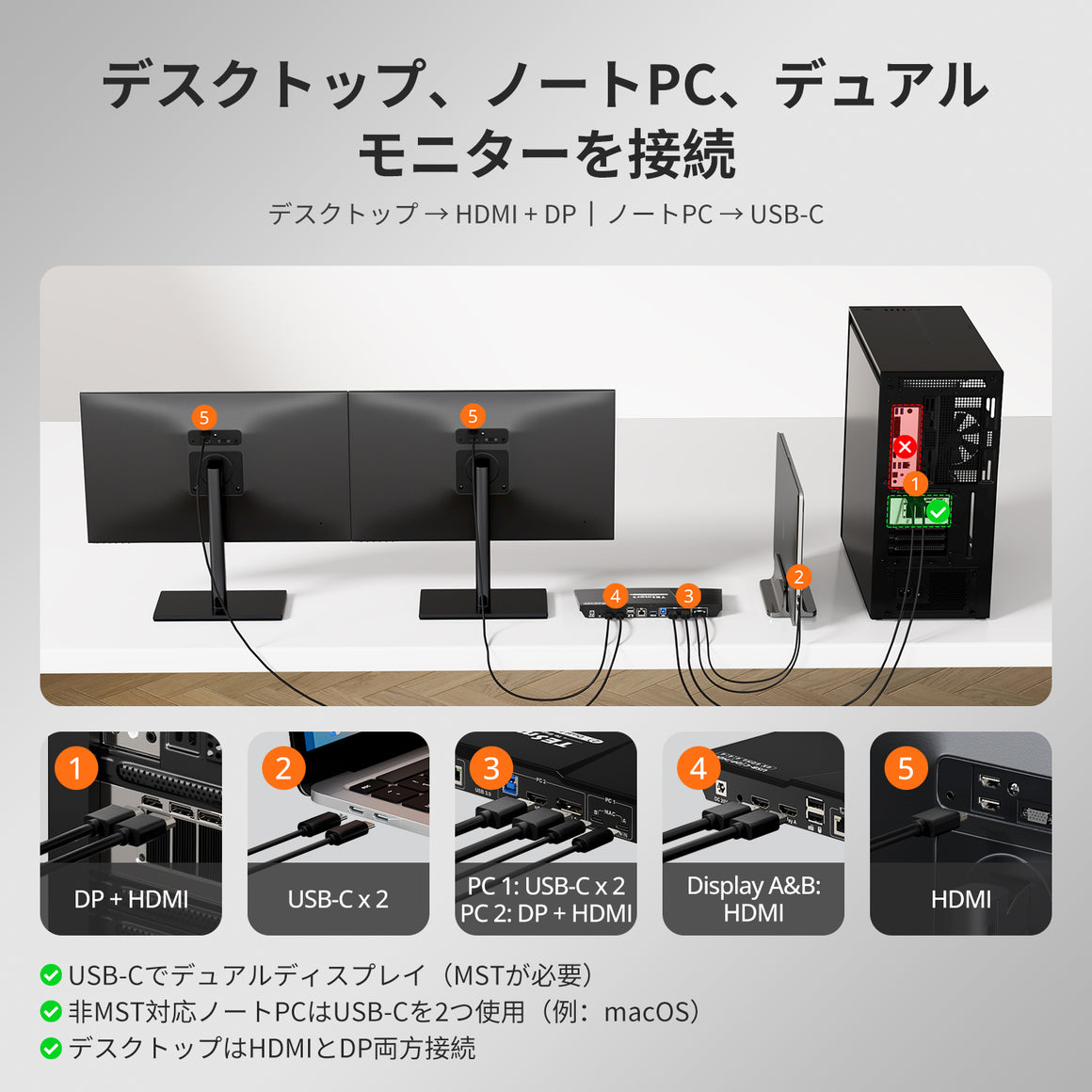 デュアルハイブリッドKVMドッキングステーションキット - USB-C、MSTおよびEDID付き、4K60Hz、ノートPC1台およびデスクトップ1台用