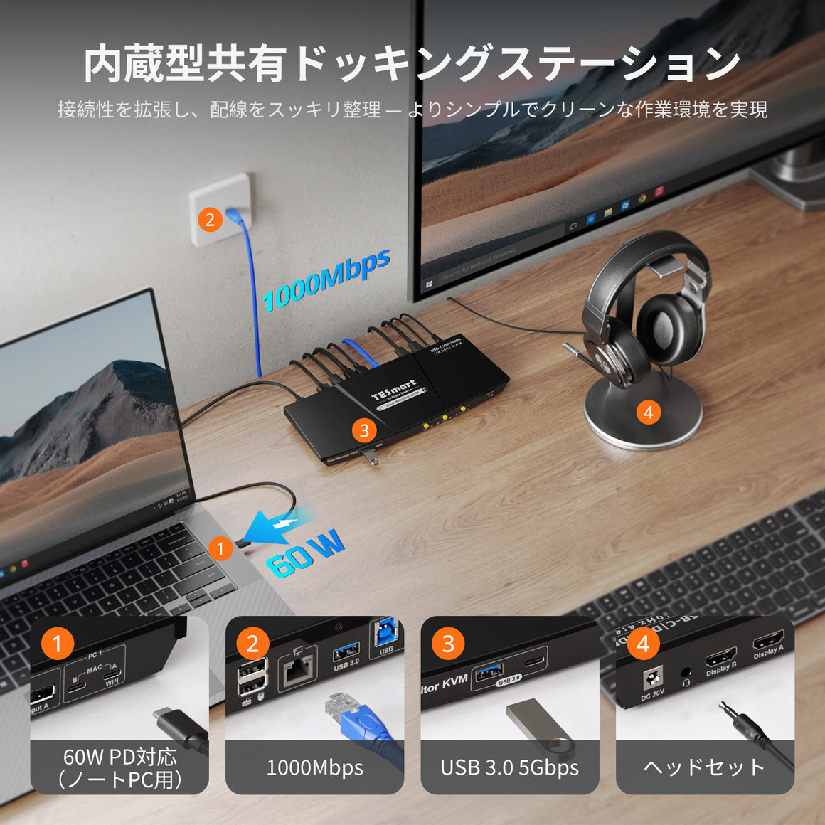 - デバイスに電力を供給する内蔵充電モジュールと、ラップトップとデスクトップを1本のケーブルでインターネットに接続するネットワークスイッチを装備しています。