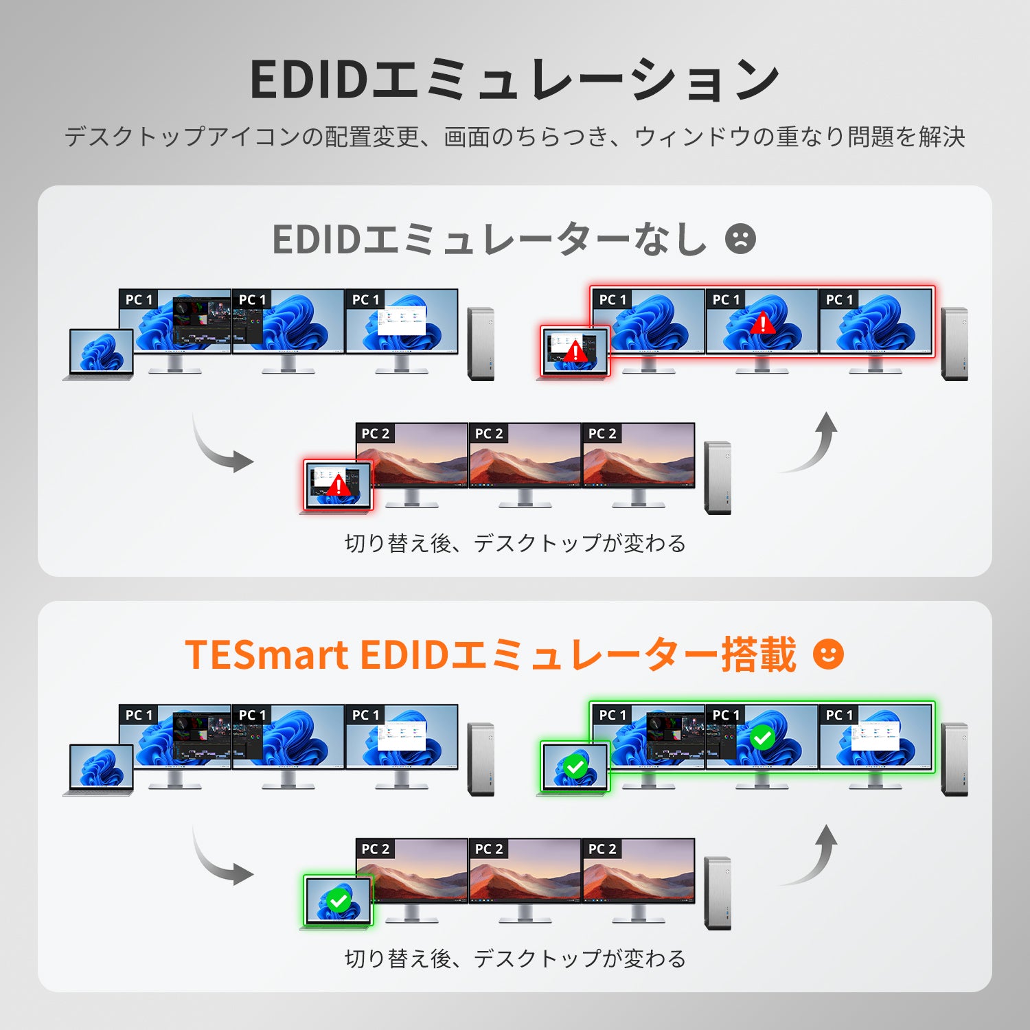 - EDIDエミュレータで正確なディスプレイ情報を維持。