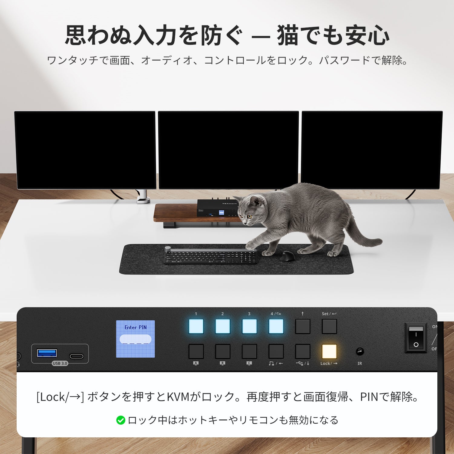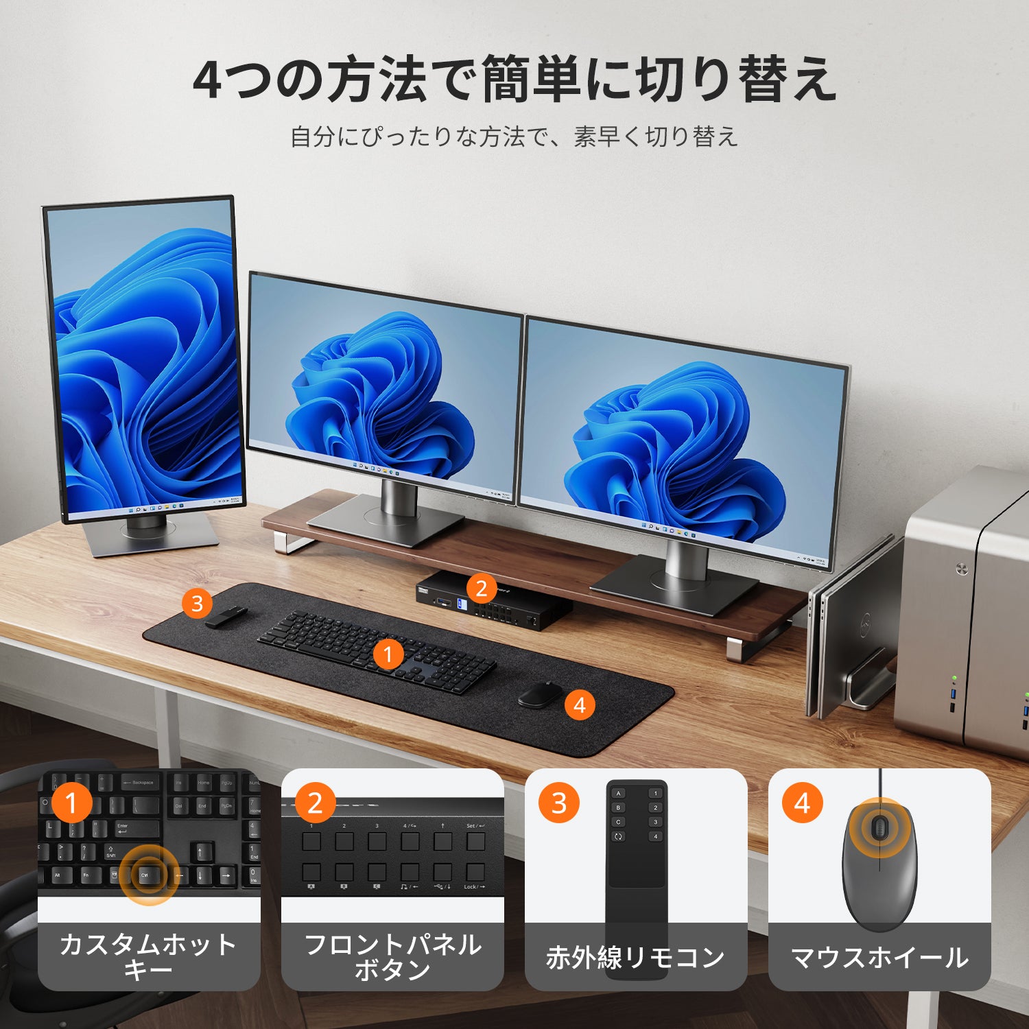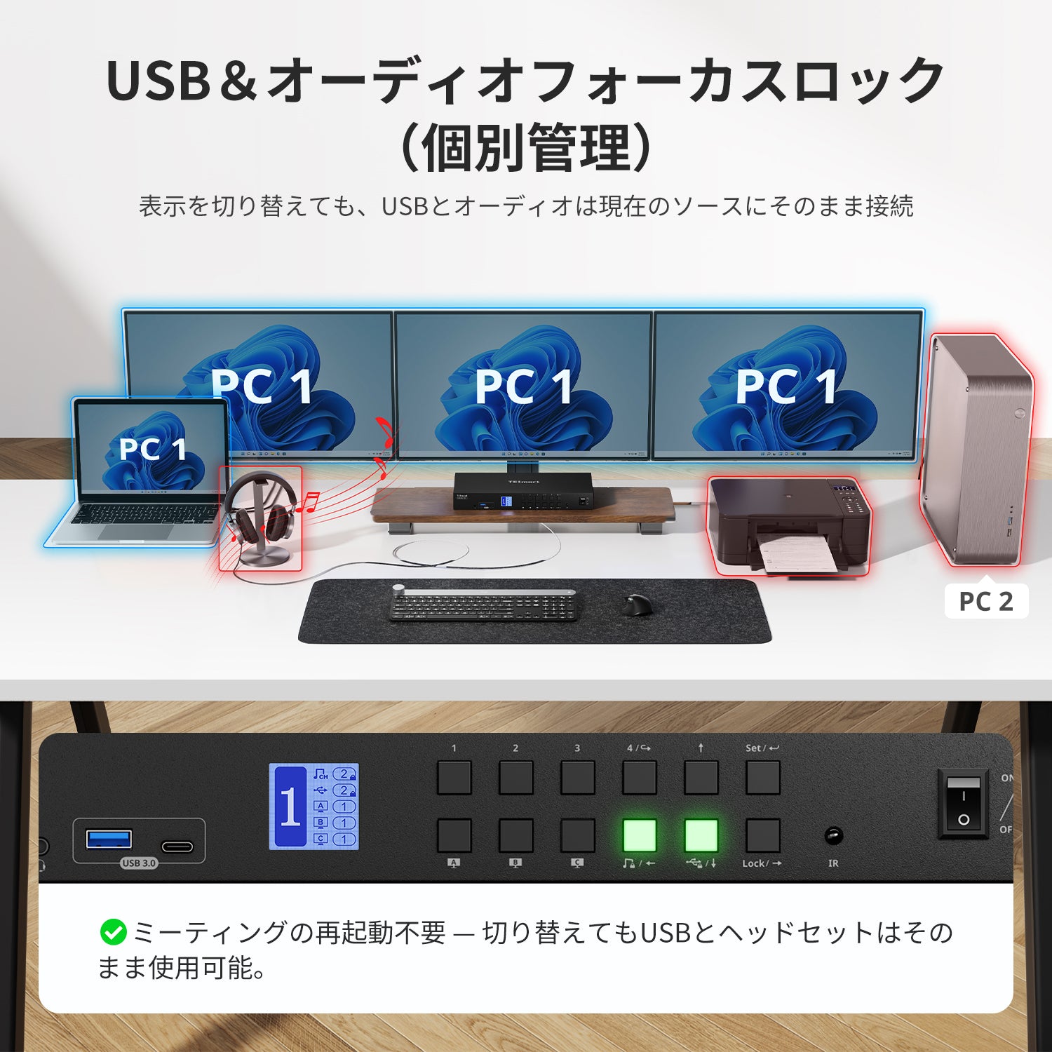 1台のノートPCと3台のPCによるトリプルモニタセットアップ用に最適化されています。複数画面でのマルチタスクに最適です。