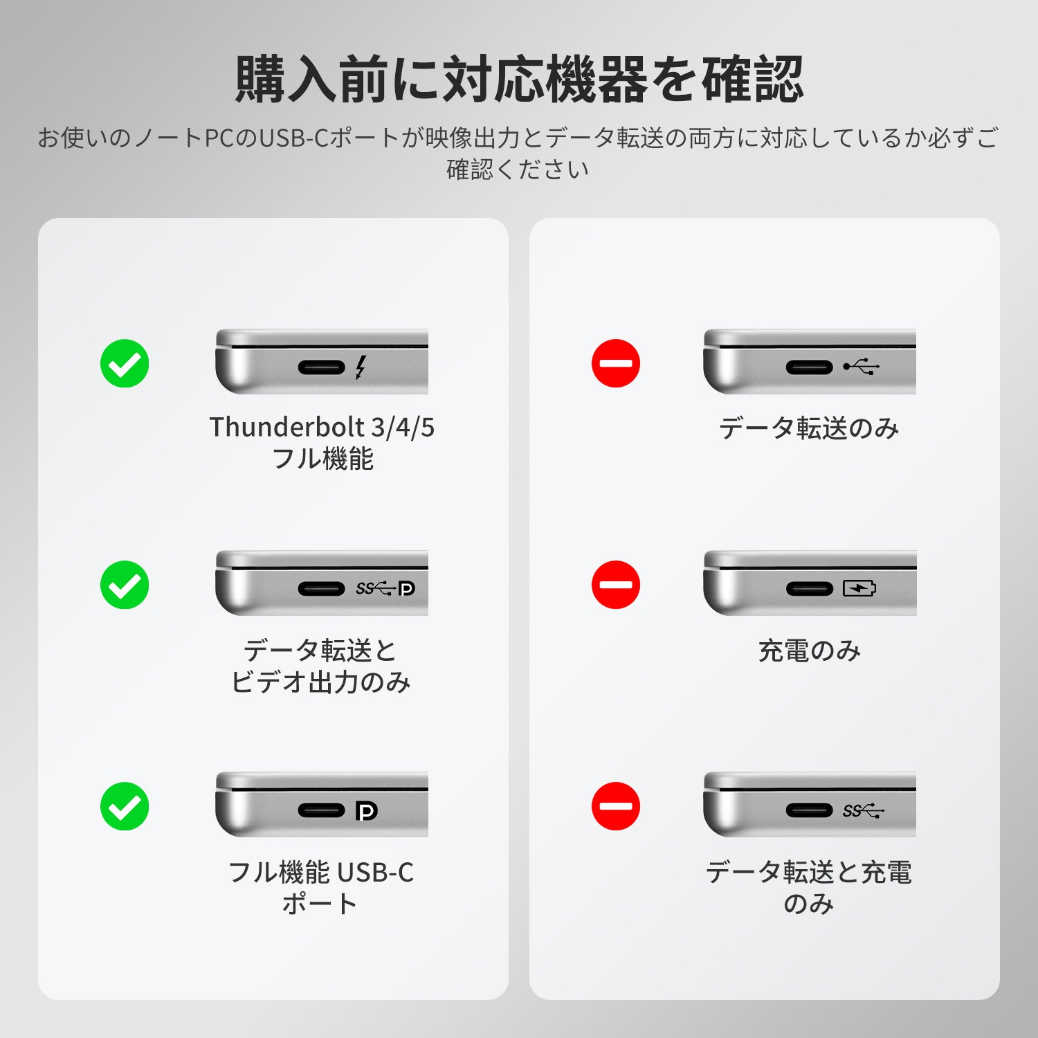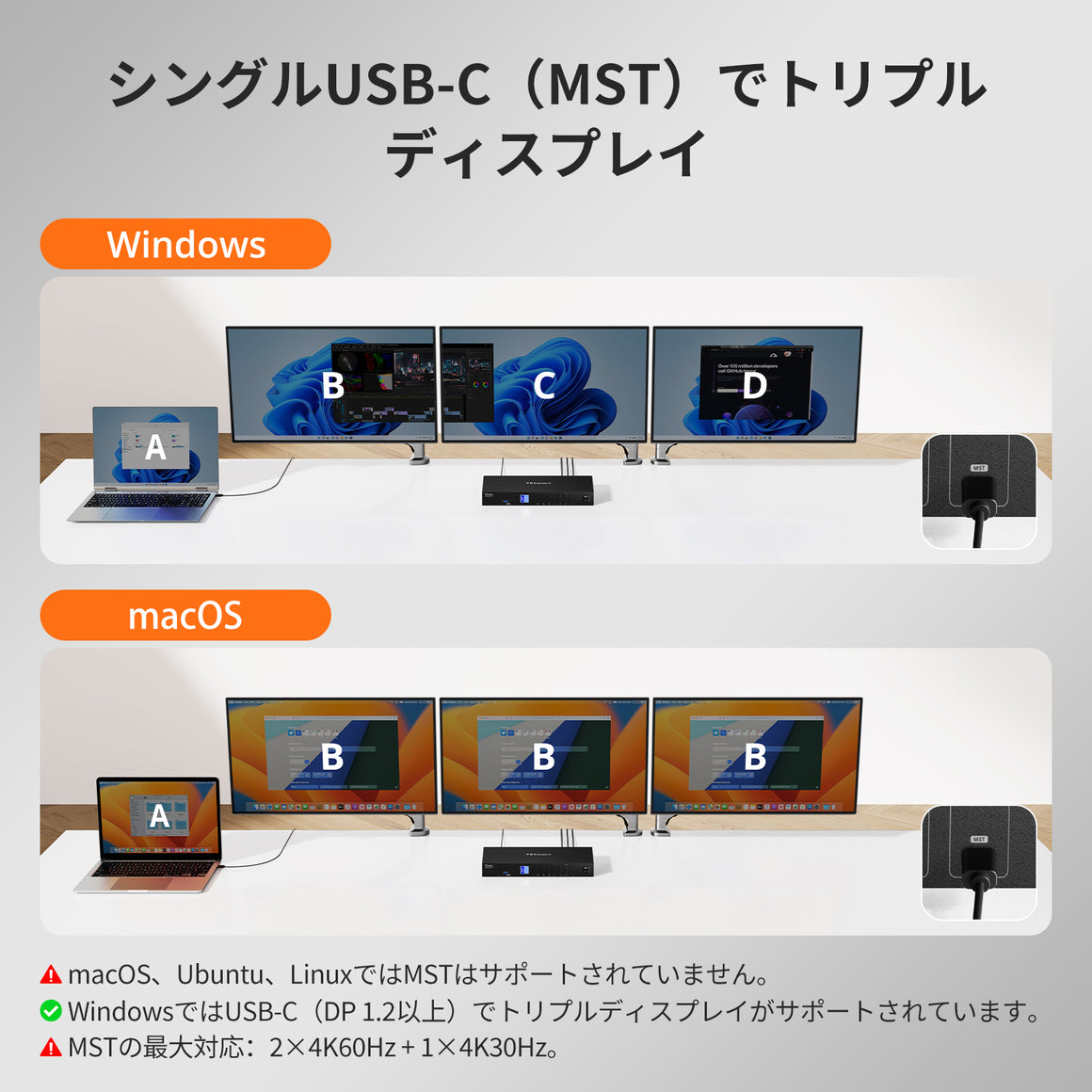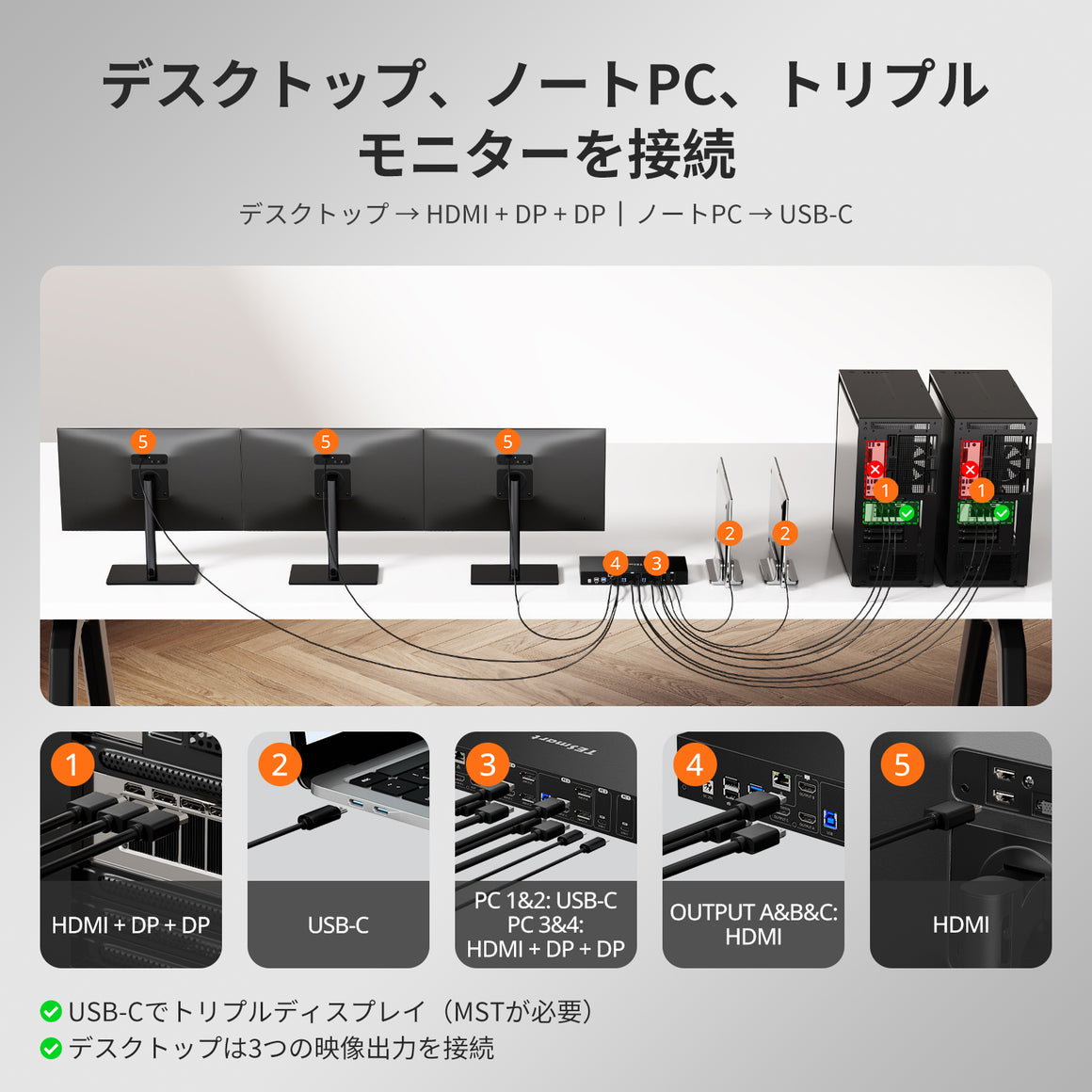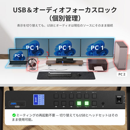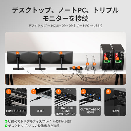 KVMスイッチで最適なパフォーマンスを得るには、お使いのPCのUSB-C/DPポートがMSTに対応していることをご確認ください。