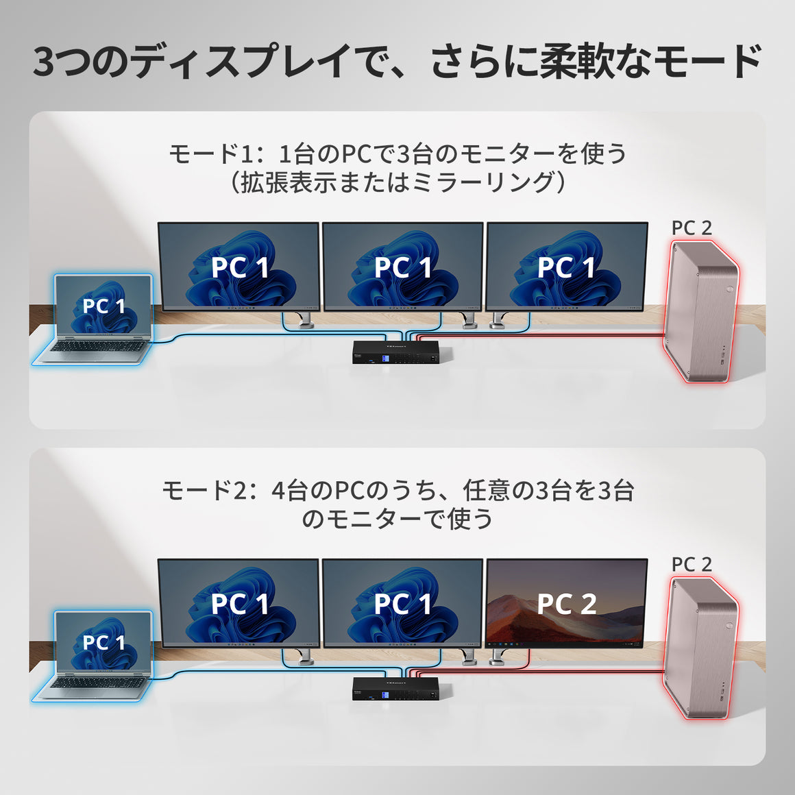 MSTテクノロジーを活用して、PC1のUSB-CまたはPC2のDPの1つのポートに3台のモニターを接続できます。