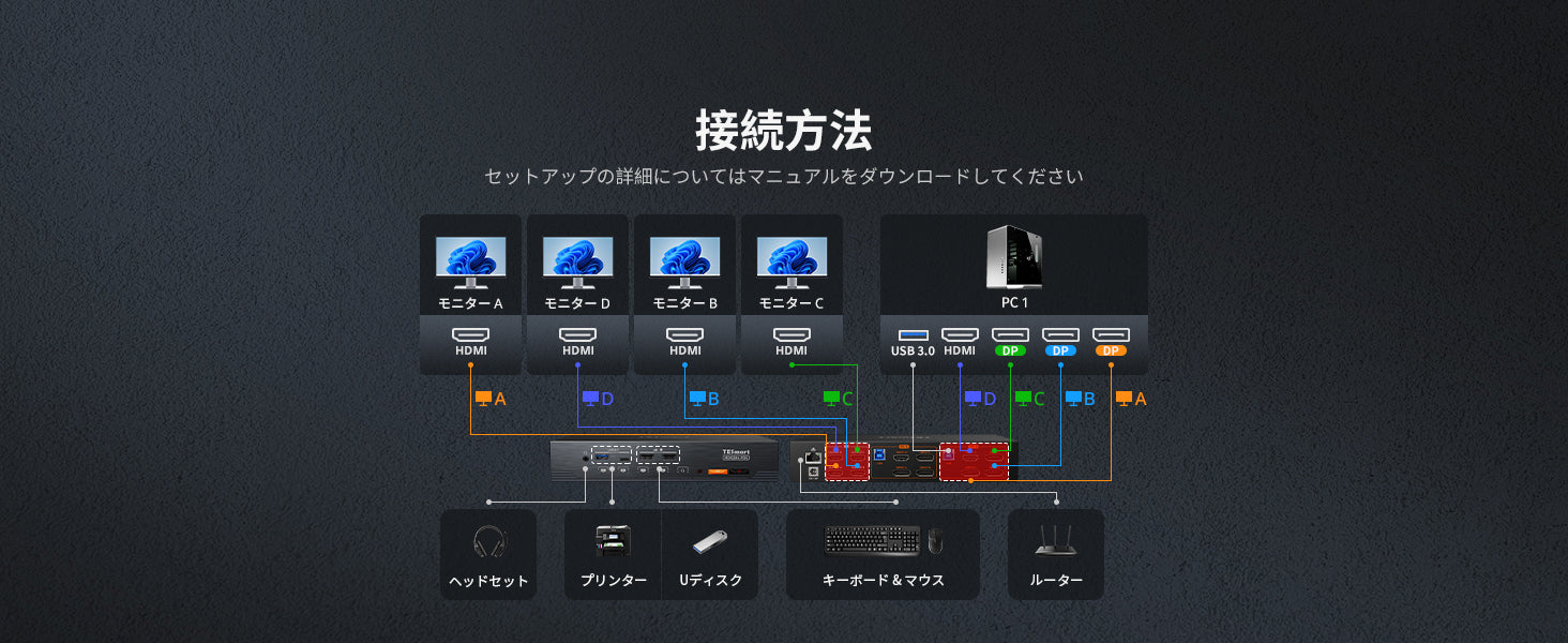 2セットの入力(各PCにHDMI+DP+DP+DP+USB-B)と4つのHDMI出力、信号変換器なしでGPUに直接接続