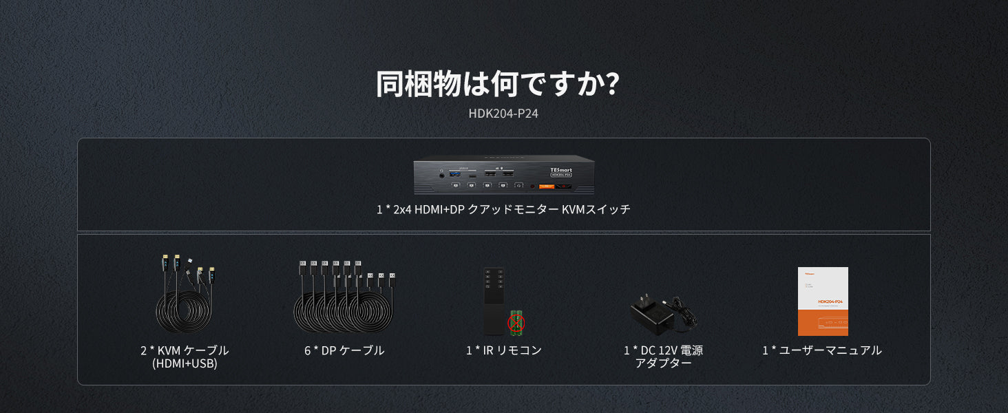 同梱品:2本のKVMケーブル(HDMI+USB)、6本のDPケーブル、赤外線リモコン、12Vアダプター