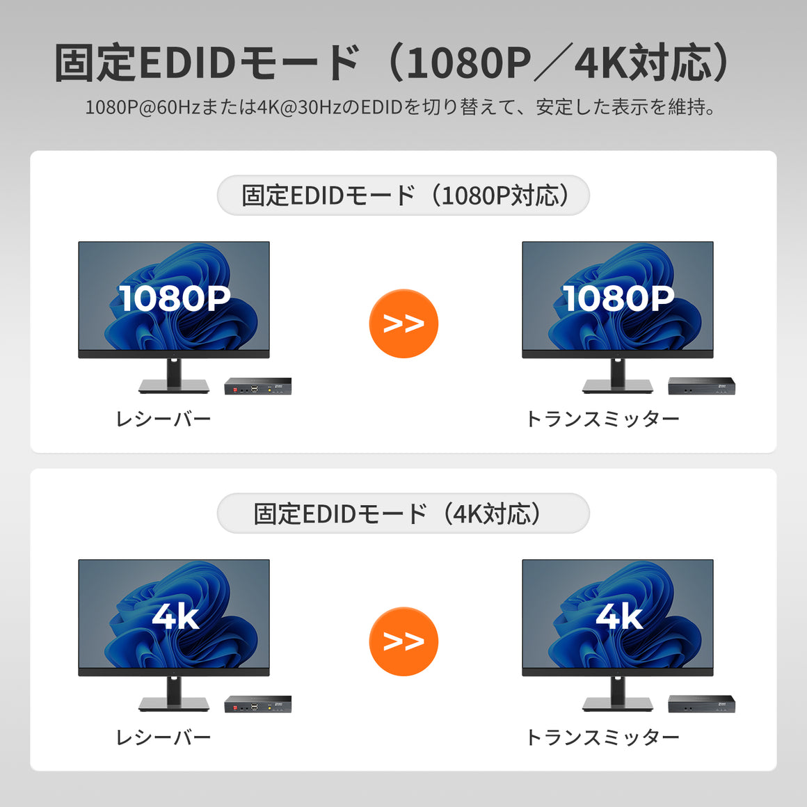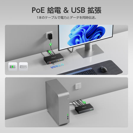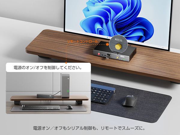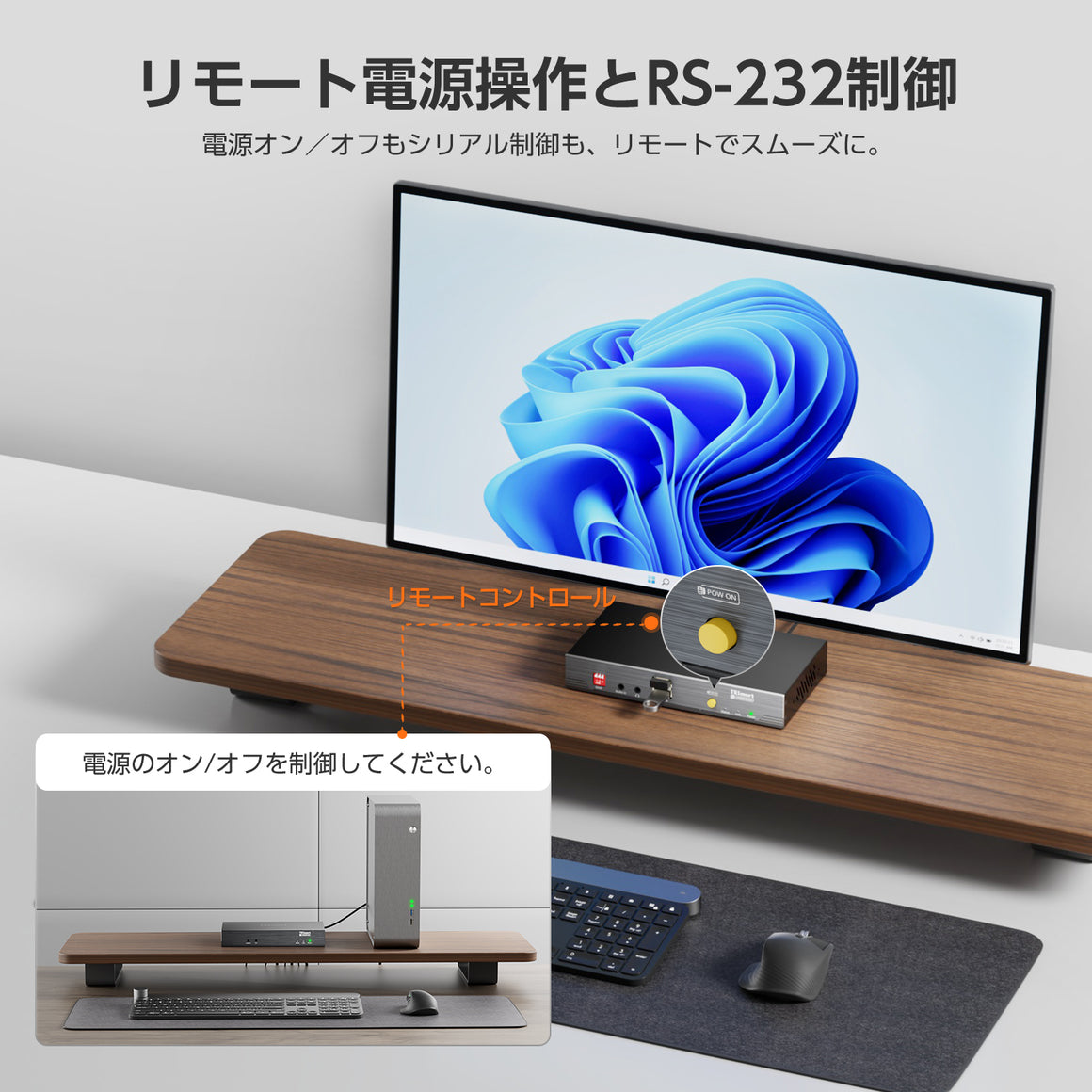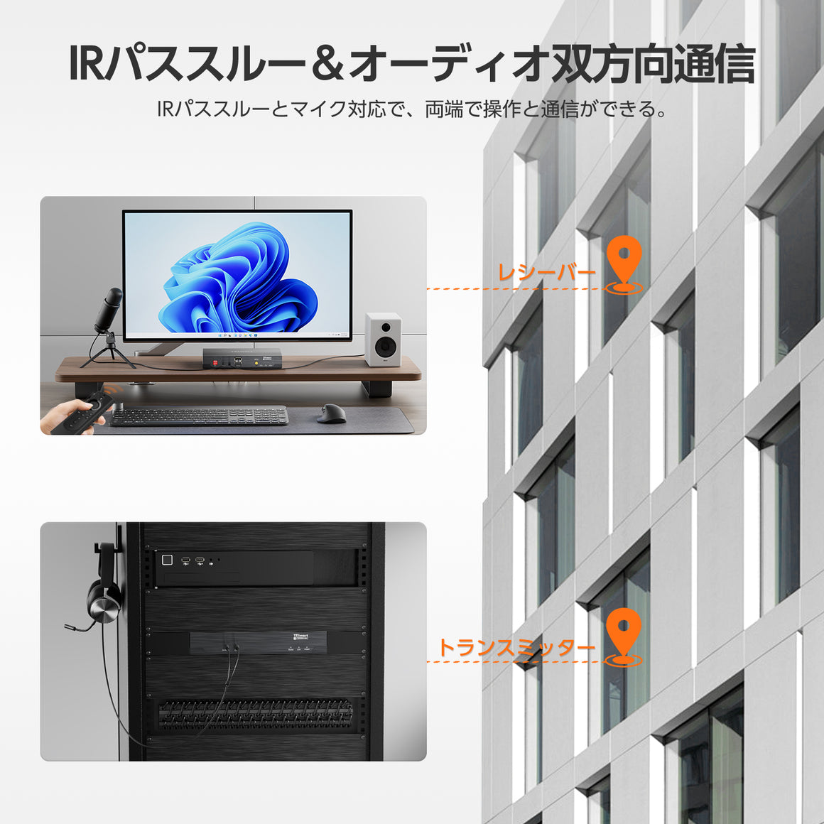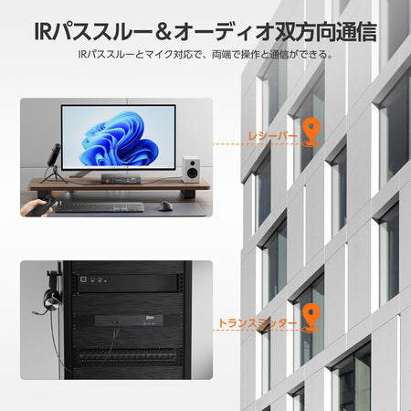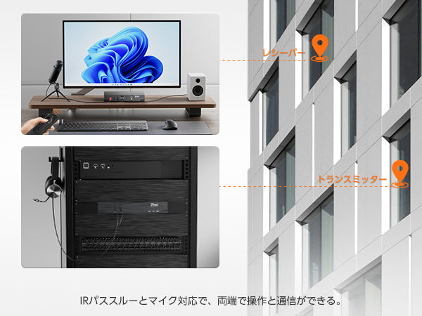 双方向でIR信号を伝送。デスクの単一リモコンでソース位置のメディアプレーヤーを制御したり、視聴室のリモコンでコンピューターを操作したり可能。直接の見通し線は不要。