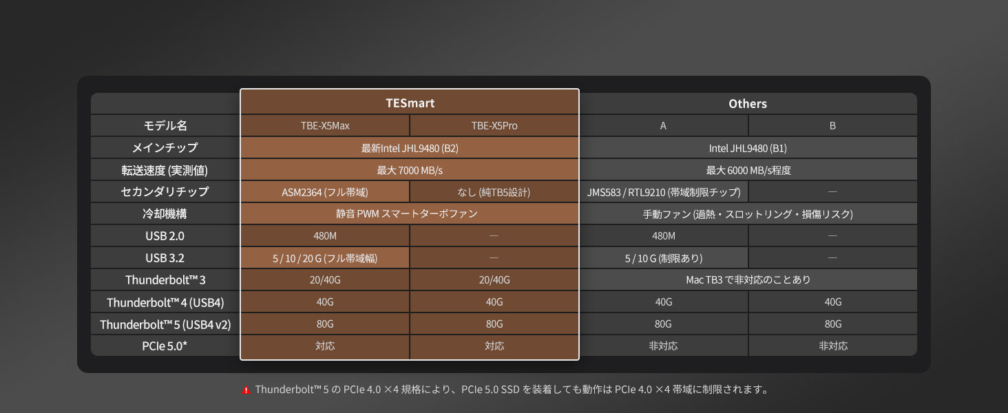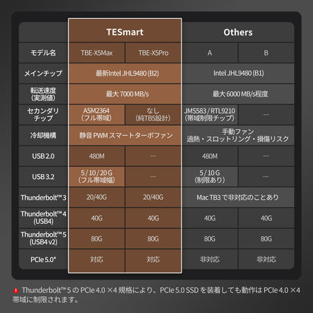 最新のIntel JHL9480(B2)Thunderbolt™ 5コントローラーを搭載したTESmart X5シリーズは、外部ストレージの速度を再定義します。