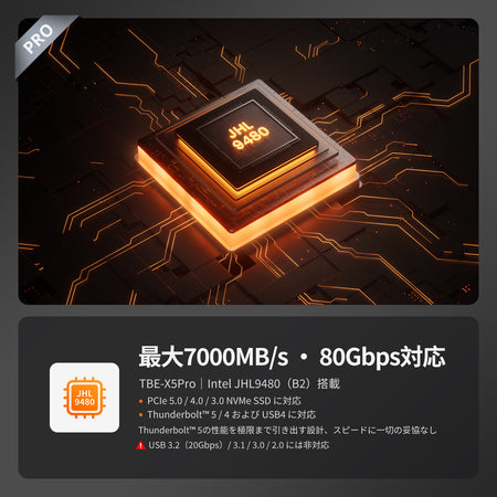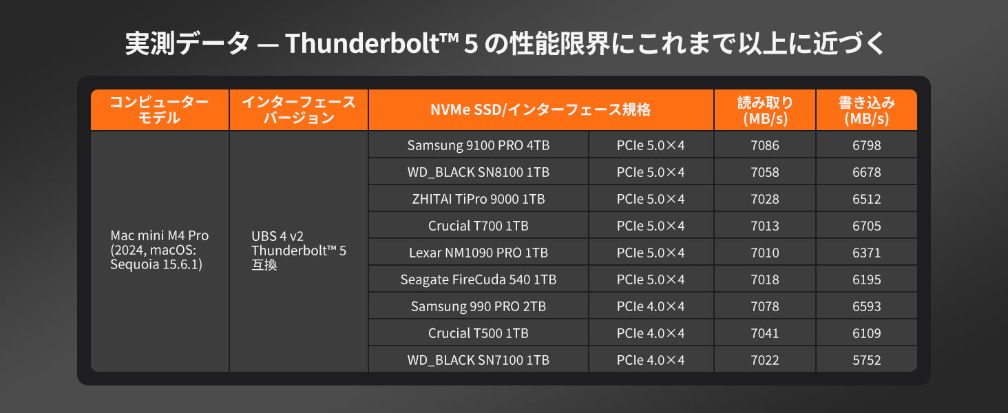 • 実測最大7000 MB/sのスループット — Thunderbolt 4の2倍の帯域幅。