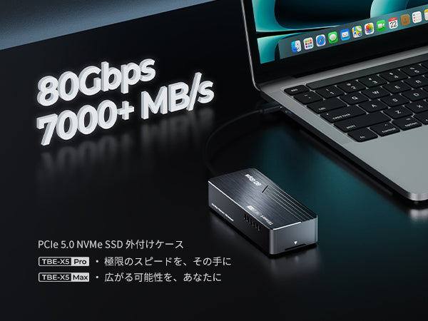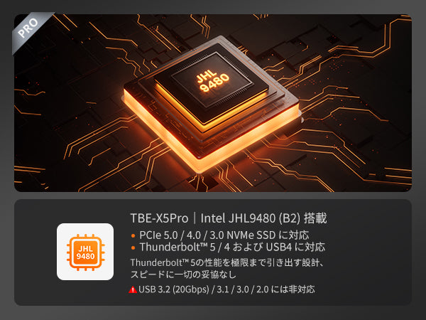 インテル最新のThunderbolt™ 5チップセットの性能を最大限に引き出したX5Proは、PCIe 5.0ドライブの限界に挑みます。